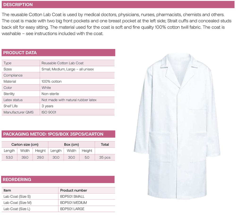 This laboratory coat is a versatile, unisex garment designed for professional use in laboratory settings. Made from 100% reusable cotton, it offers durability and comfort for extended wear. The coat features a knee-length design with long sleeves, ensuring adequate coverage and protection.