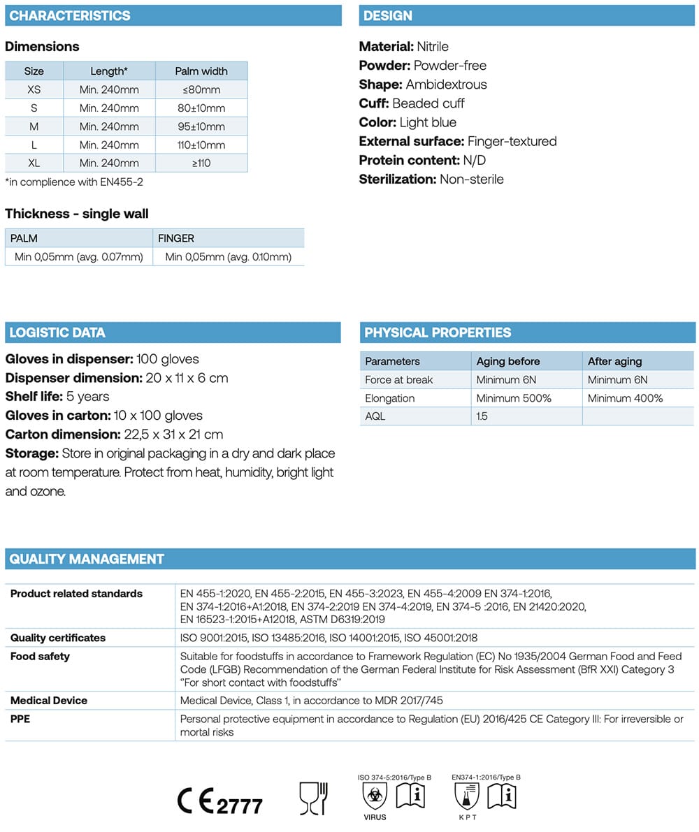 They feature a penetration time exceeding Class 3 standards and meet the requirements of ASTM D6319 for additional safety. Furthermore, they are food-safe according to EC No. 1935/2004, compliant with MDR 2017/745 Class 1, adhere to PPE Regulation 2016/425 CAT III, and conform to EN 2140. These features make them a versatile and reliable choice for a wide range of applications.