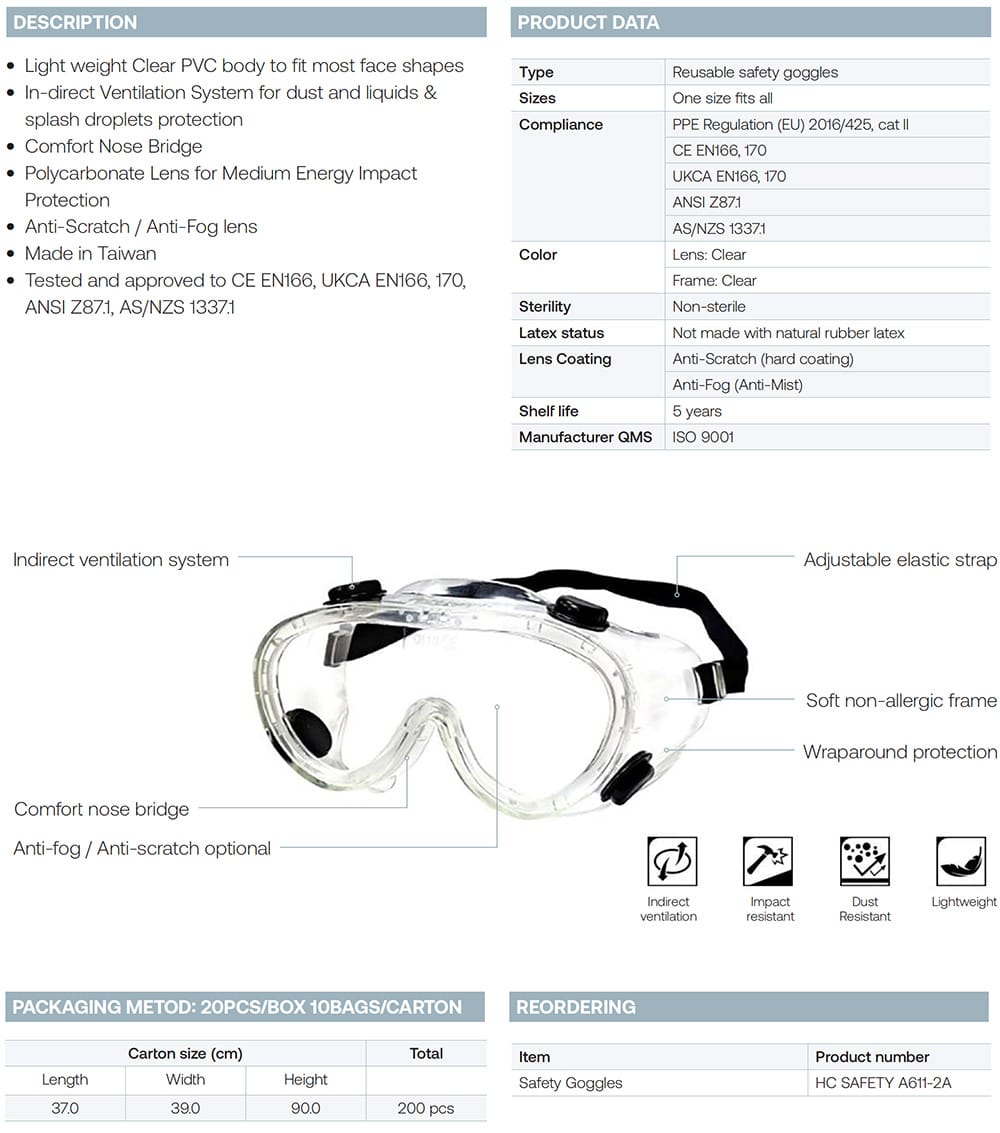 Laboratory safety goggles protect eyes from splashes, chemicals, and debris. Made with durable polycarbonate lenses, they offer high impact resistance and feature side and top shields for extra protection. Anti-fog and scratch-resistant coatings ensure clear vision, while the adjustable headband keeps them securely in place. Designed to fit comfortably over prescription glasses, they meet EN 166 and ANSI/ISEA Z87.1 standards and are reusable, making them a reliable, cost-effective choice for lab safety.