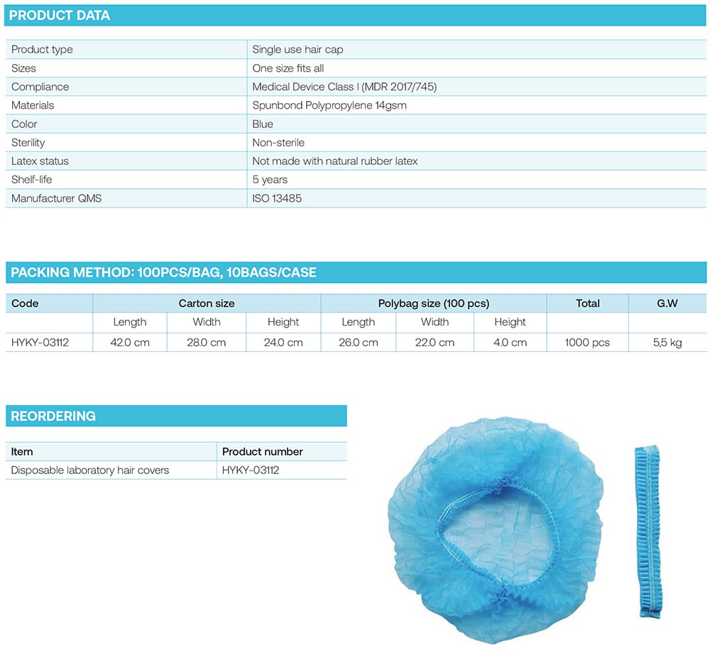 The cap is blue, latex-free, non-sterile, and features an elastic band that can stretch to an opening of at least 54 cm, providing a secure and comfortable fit. This hair cap is an ideal choice for maintaining hygiene in laboratory settings.