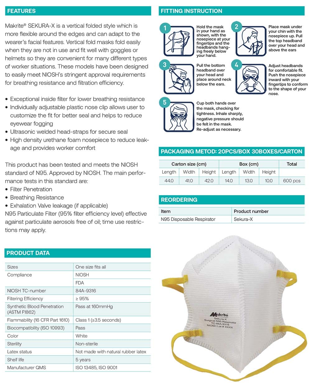 Featuring dual headbands and an adjustable nose clip, it ensures a secure and comfortable fit for various face shapes and sizes while effectively minimizing air leakage. Its vertical-fold design maintains breathability and prevents collapse during use. The respirator is latex-free, valve-free, and individually packaged for enhanced safety and convenience, making it a dependable choice for healthcare professionals and laboratory workers.